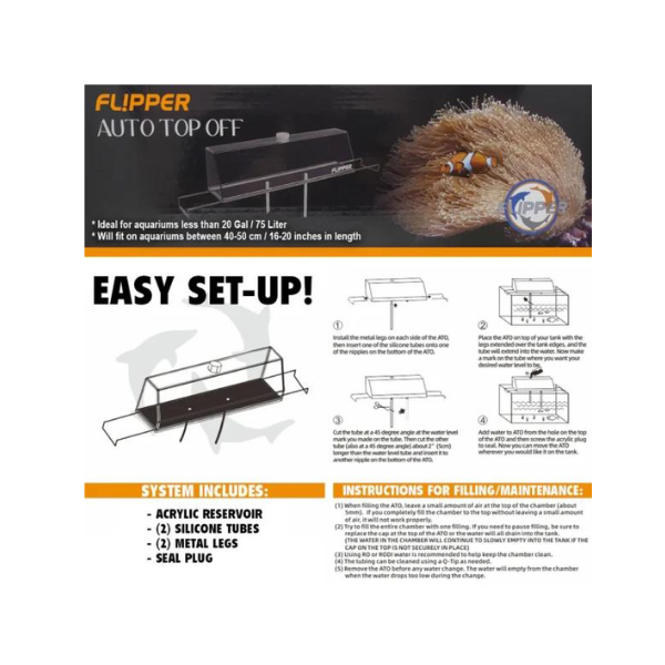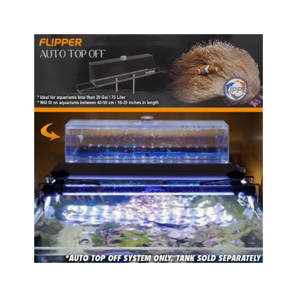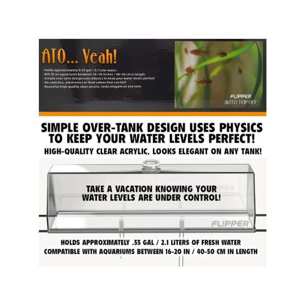 Flipper Ato Auto Top Off Clear Acrylic Aquarium Water Storage Reservoir System System keeps your aquarium water levels perfect using simple physics... no floats, switches, or electronics which can fail. Gone are the days of manually adding water to your tank. Aquarium maintenance just got easier! Stable water levels result in consistent salinity which keeps your tank inhabitants happy and healthy. Freshwater tanks benefit from one less daily maintenance chore.