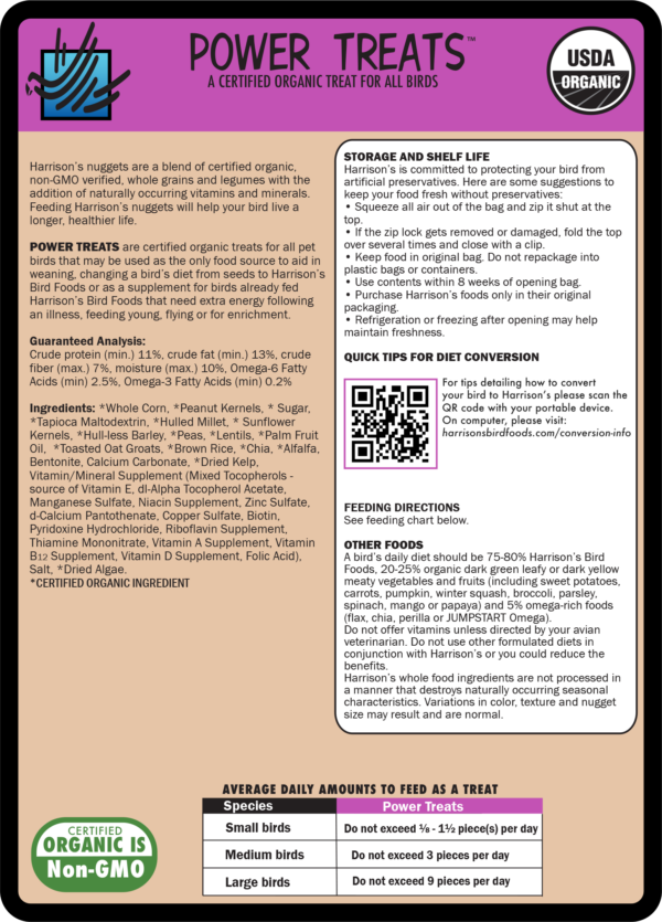 POWER TREATS are certified organic treats for all pet birds that may be used as the only food source to aid in weaning, changing a bird’s diet from seeds to Harrison’s Bird Foods or as a supplement for birds already fed Harrison’s Bird Foods that need extra energy following an illness, feeding young, flying or for enrichment.