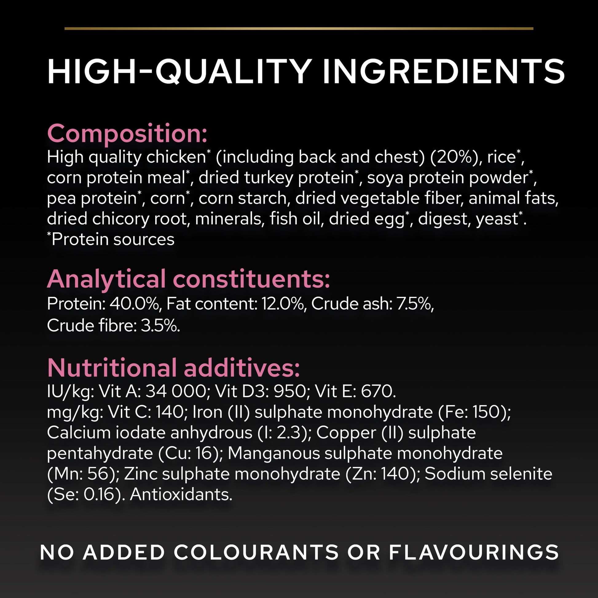 Purina Pro Plan Sterilised Adult Delicate Digestion Dry Cat Food is formulated with chicken pieces as the first ingredient and other highly digestible selected protein sources without any wheat to help ease the digestive process of neutered cats. The product is highly palatable and can satisfy even the fussiest cats. Purina Pro Plan Sterilised Adult Delicate Digestion is also enriched with arginine, antioxidants and omega3 fatty acids to maintain urinary health of your cat. The carefully formulated dry cat food helps to reduce the feeling of hunger through a high protein content, complex carbohydrate sources and adequate fibre content contributing to an ideal cat's body weight.