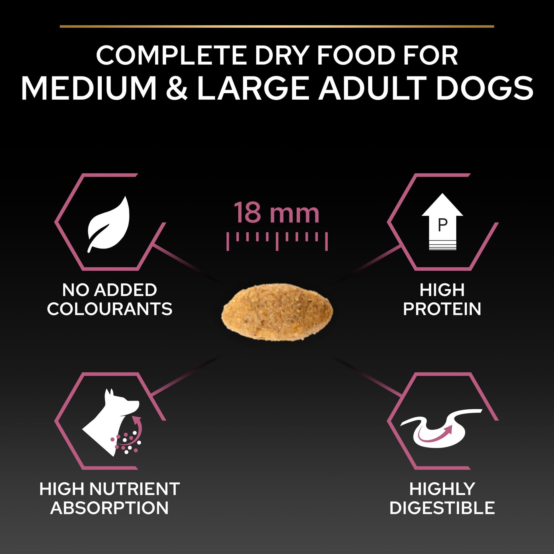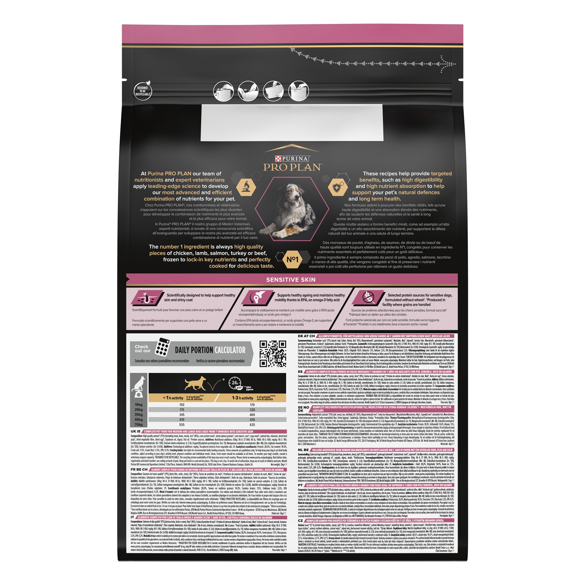 Purina Pro Plan Sensitive Skin Medium and Large Senior 7+, Dry Dog food with Salmon is made with highquality salmon pieces as the first ingredient. This dry dog food is carefully formulated with selected protein sources and no wheat so it is especially suitable for sensitive dogs. Boosted levels of long chain omega3 fatty acids (0.7%) help manage sensitive skin.. This recipe has adapted levels of protein and fat to maintain lean body condition. EPA, an omega3 fatty acid, supports the mobility of your dog's joints for healthy ageing.