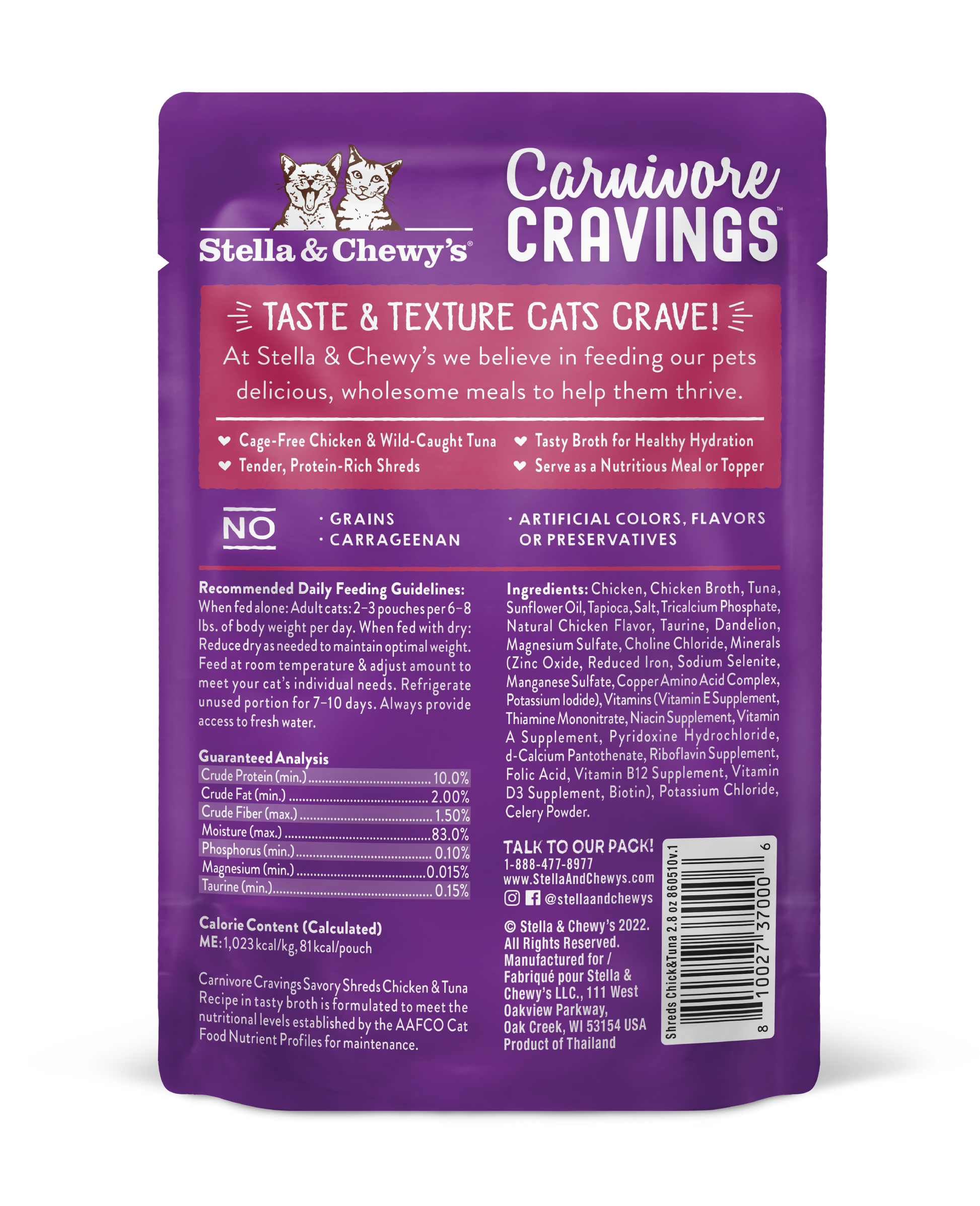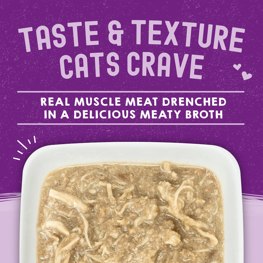 A protein-rich diet that includes real shredded poultry or fish, real nutrition, and real taste to get your cat purring! A perfect complete meal or tasty kibble topper!
